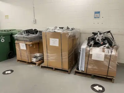 3 palettes de déchets électroniques sur un quai de chargement