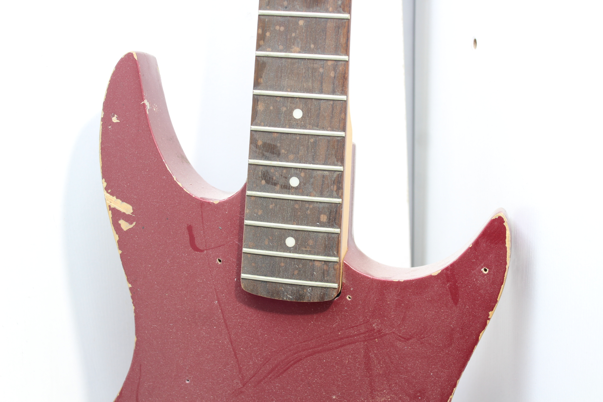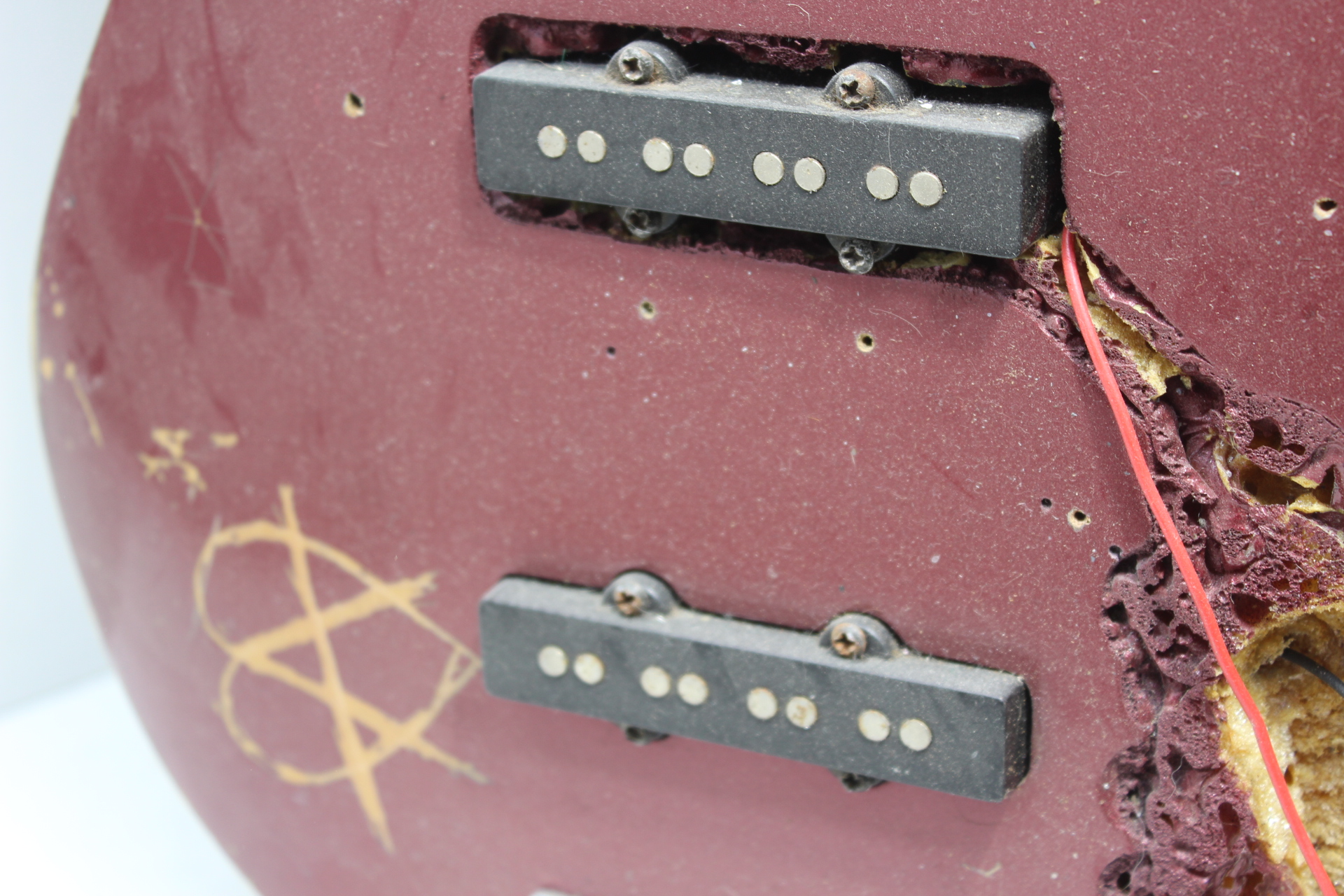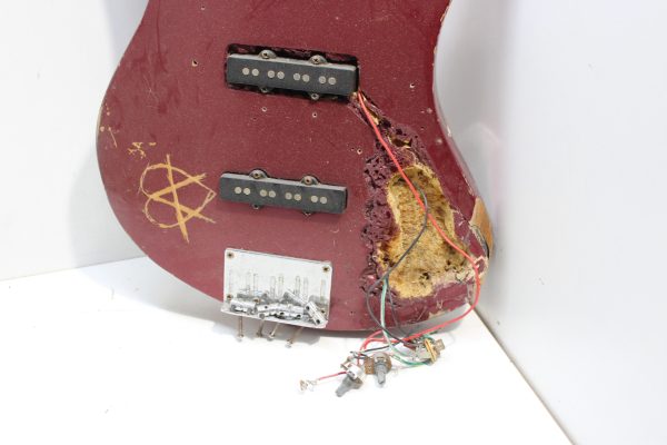 In pretty rough shape. Needs a lot of love to be brought back. Electronics/wiring need to be redone, needs a new cavity cover, body work, one tuning peg knob and a nut. Action appears good, has an adjustable truss rod. Manufacturer and model unknown.