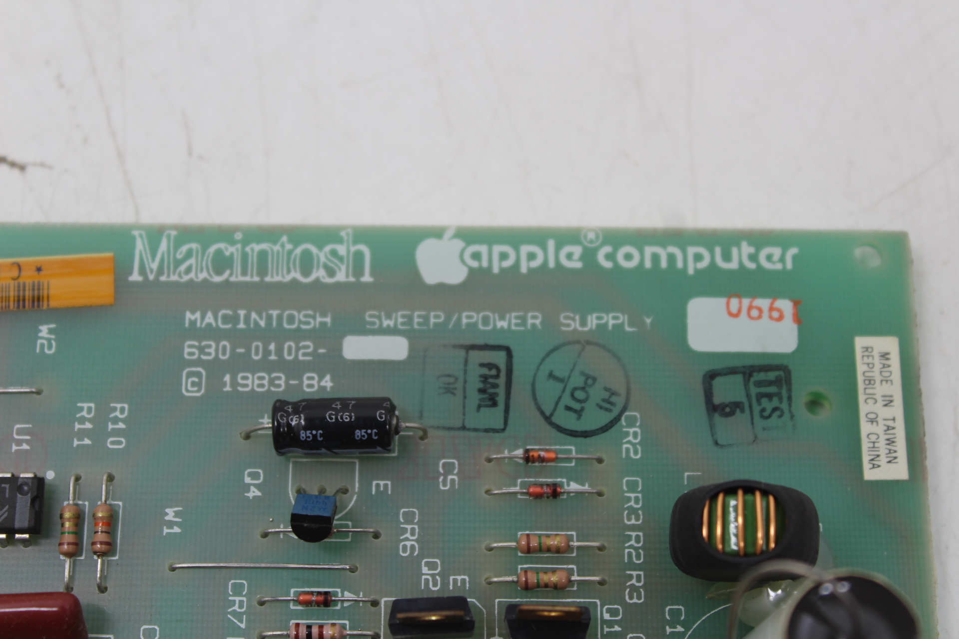 Came from a batch of Macintosh Plus spare parts. Was marked as »burned-out ». Not completely sure of issue but board and nearly all components appear to be OK.