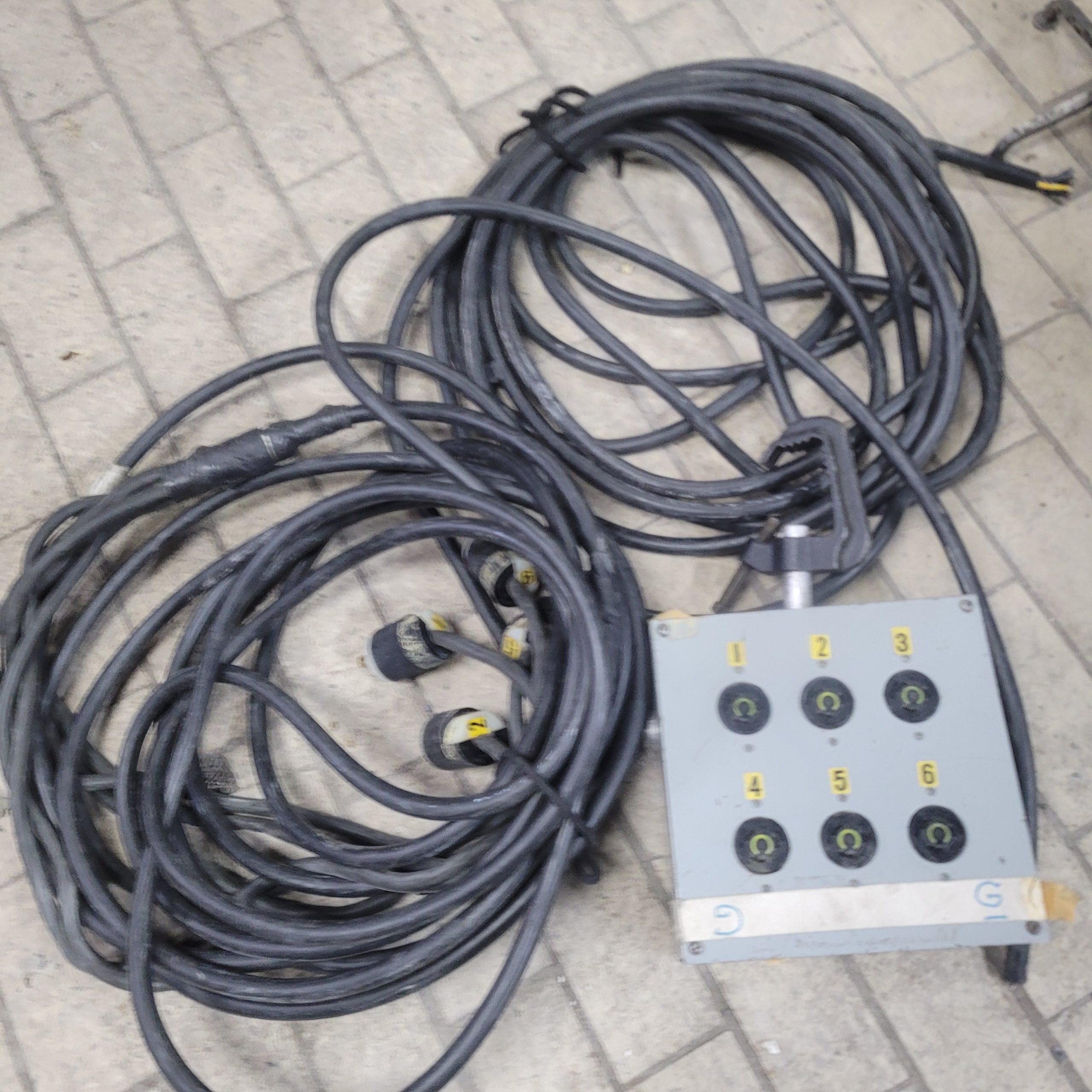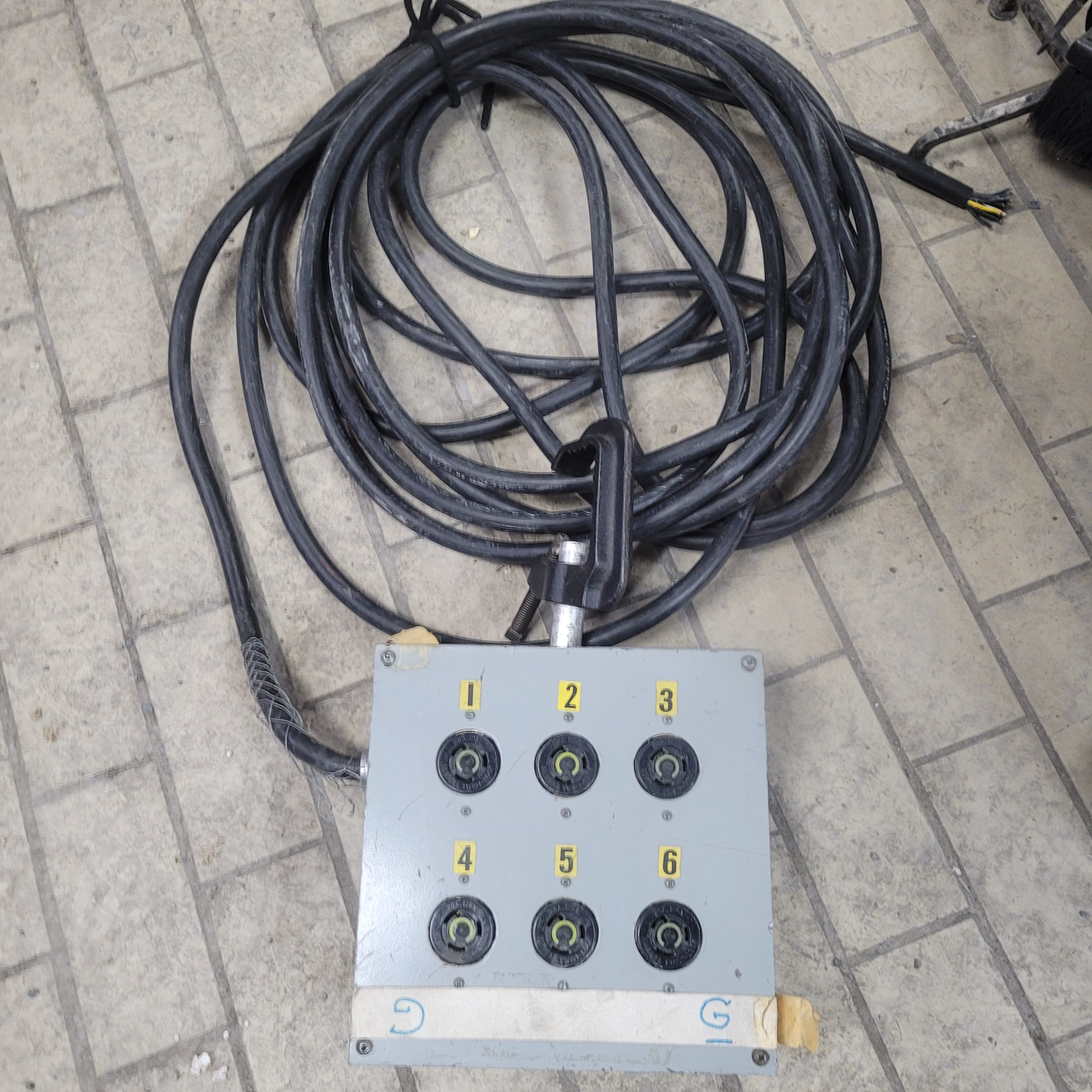 Original usage unknown. There is one 17′ breakout cable with 6 twist locks, and one control box with 6 twist locks inputs connected to a 15′ cable.